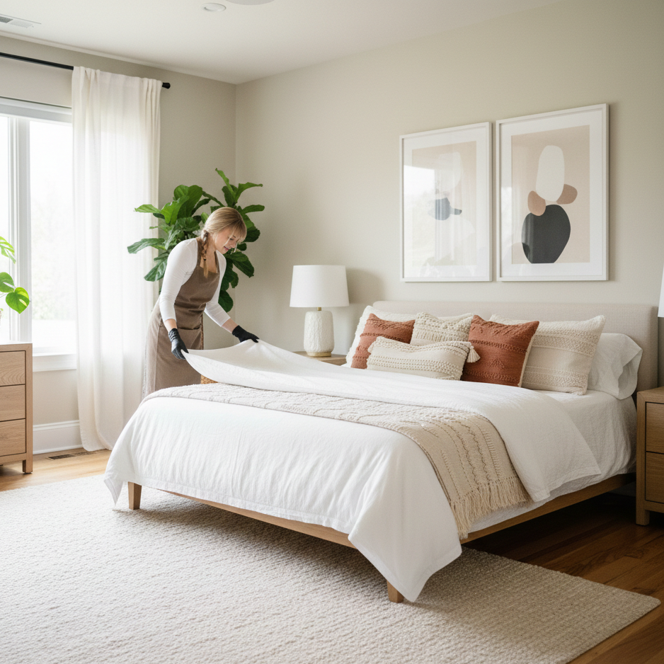 We follow comprehensive, room-by-room cleaning checklists to guarantee consistency with every visit. Our trained and vetted cleaning professionals take pride in precision, presentation, and reliability—so your home looks immaculate every time. From routine maintenance to deep cleaning services, Halo Haven is committed to becoming Draper’s premier luxury cleaner by delivering dependable results with elevated attention to detail.Detailed bedroom cleaning service in Draper, Utah including furniture, decor, and hard-to-reach surfaces.